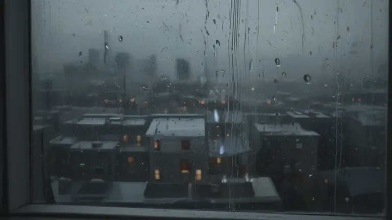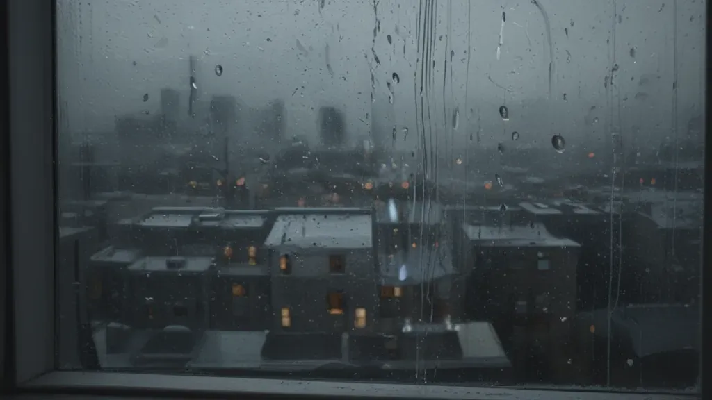 Raindrops glisten on the window, reflecting the soft, diffused light of the cityscape, creating a serene and contemplative atmosphere. The shallow depth of field isolates the raindrops, drawing attention to the texture and the interplay of light and shadow.