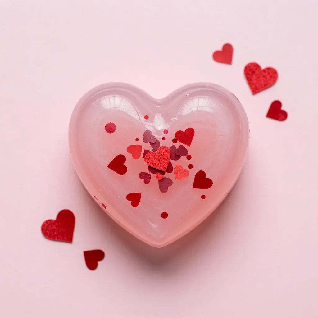 A heart-shaped soap with glittery hearts, smooth and glossy, set against a pale pink background, softly lit to highlight the soap's surface and the scattered hearts, creating a clean and simple backdrop that keeps the focus on the soap.