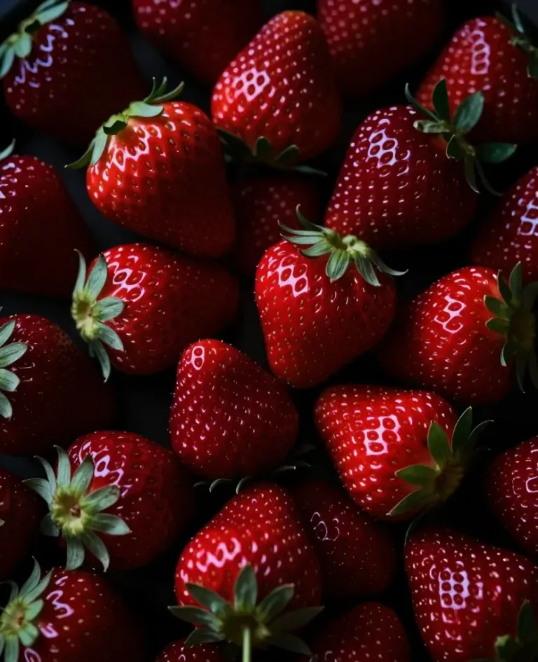 Vibrant red strawberries with glossy, bead-like texture and green stems, illuminated by soft, diffused light from above, creating highlights and reflections. The dark, blurred background emphasizes the strawberries as the focal point, creating a sense of abundance and depth.