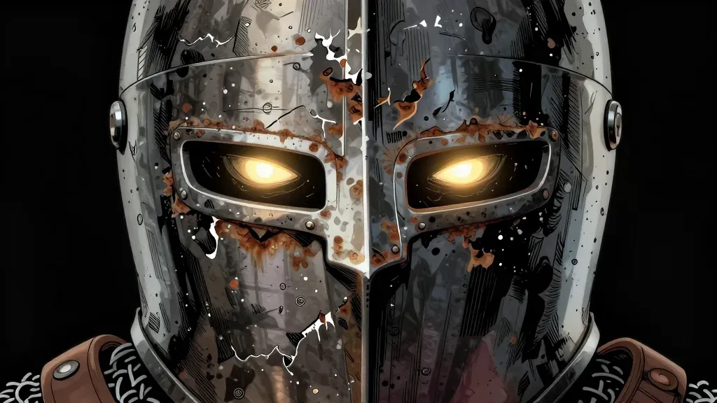 A close-up of a rugged, metallic visor splattered with rust and dirt, illuminated by warm golden light from within, creating dramatic highlights and shadows. The dark, blurred background emphasizes the visor as the main subject, offering a shallow depth of field for copy space.