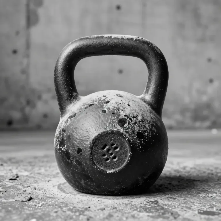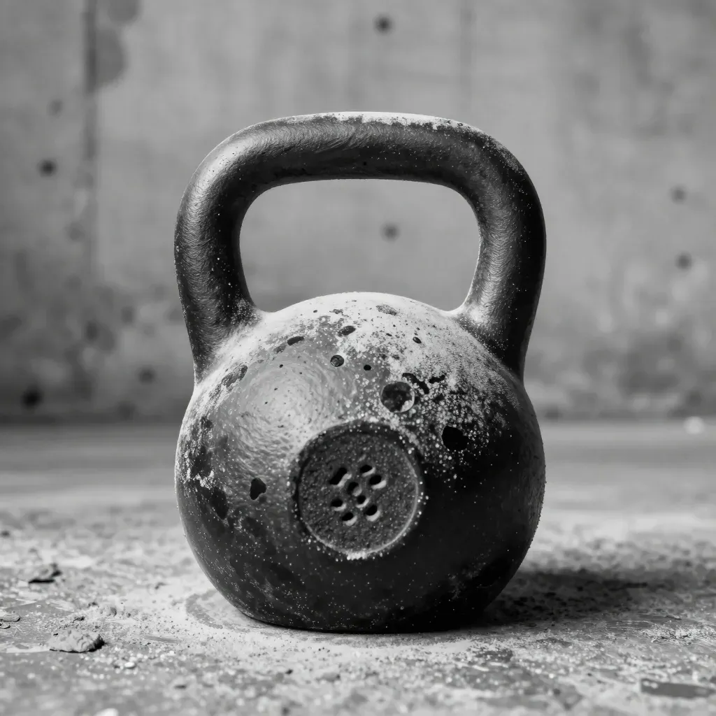 A close-up of a rough, speckled kettlebell with fine ridges, illuminated by soft, diffused lighting that highlights its texture and casting gentle shadows. The blurred concrete wall background ensures the focus remains on the kettlebell's intricate details.