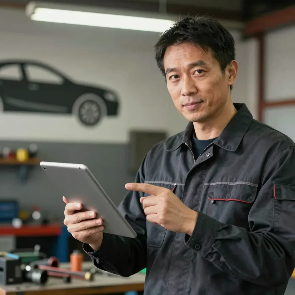 A mid-40s male mechanic in a dark work jacket holds a silver tablet, pointing at its screen with a focused expression, his hands showing slight grease residue. Overhead fluorescent lighting casts even illumination with soft shadows, and a shallow depth of field blurs the background toolbench and car silhouette decal, emphasizing the subject and tablet.