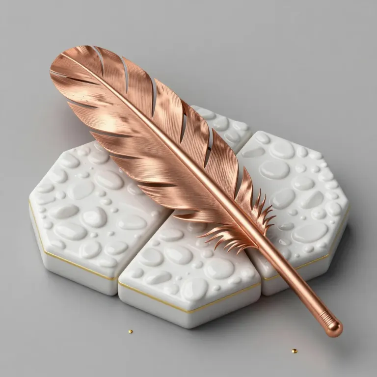 A polished copper quill with intricate feather details rests diagonally on a textured white surface with rounded indentations, highlighted by soft, diffused lighting that casts gentle shadows, creating a sense of depth and balance. The neutral gray background blurs to emphasize the quill and surface, providing ample copy space for design elements.