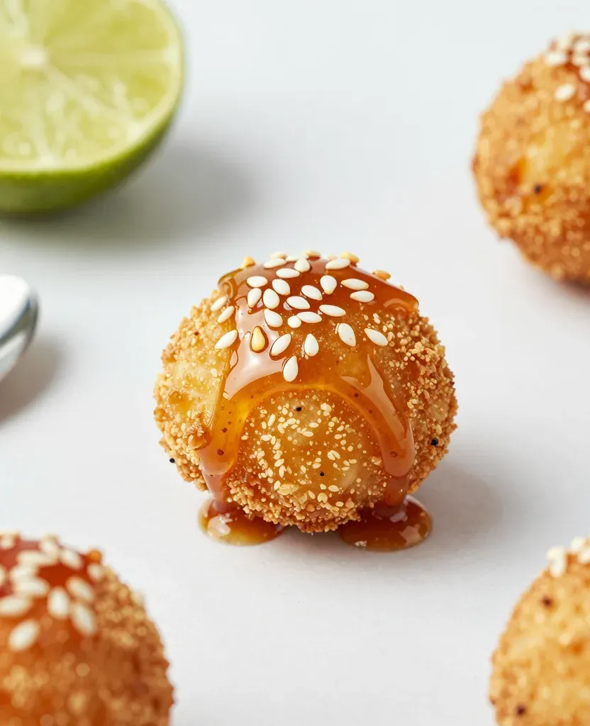 A crispy sesame-coated fried ball topped with glossy caramel sauce, with a smooth, sticky pool forming beneath it. The soft high-key lighting and shallow depth of field emphasize the texture and central subject against a clean white background.