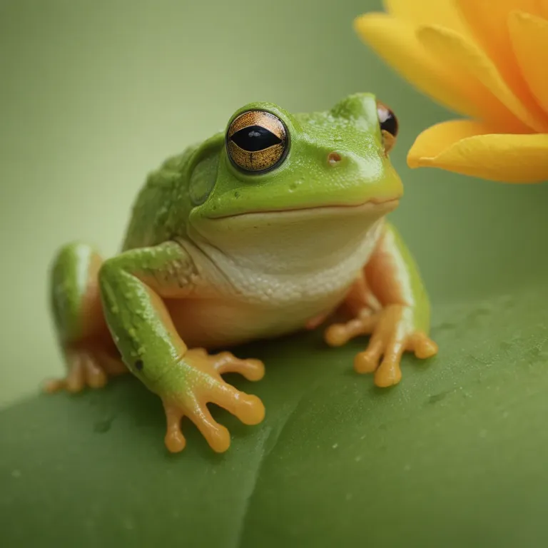 A close-up of a frog with amber eyes perched on a glossy leaf, bathed in soft morning light that highlights its smooth, bumpy skin and pale yellow legs. The shallow depth of field blurs the background, focusing attention on the frog's intricate details and vibrant colors.