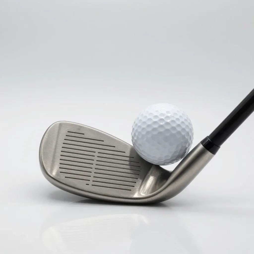 A metallic golf club head with grooves rests diagonally against a matte golf ball, both illuminated by soft, diffused light from above, creating gentle highlights. The shallow depth of field and pure white background emphasize the subjects, offering ample copy space for design purposes.