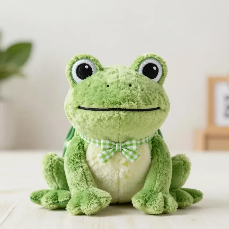 A soft, velvety green plush frog toy with glossy eyes and a smooth bow tie, illuminated by soft, diffused light from above, creating gentle shadows. The slightly elevated, close-up view and shallow depth of field highlight the toy's texture and details, making it ideal for product photography and children's content.