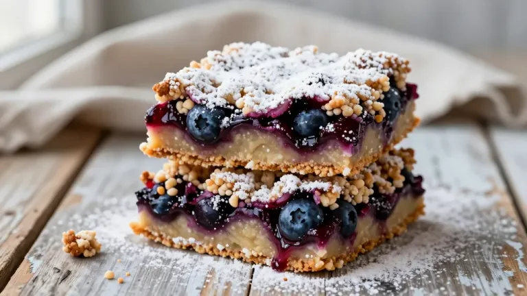 Golden crumbly crust and glossy blueberries are dusted with powdered sugar, creating a visually appealing dessert. The soft, diffused lighting enhances the warm, inviting glow of the rustic, homely setting.