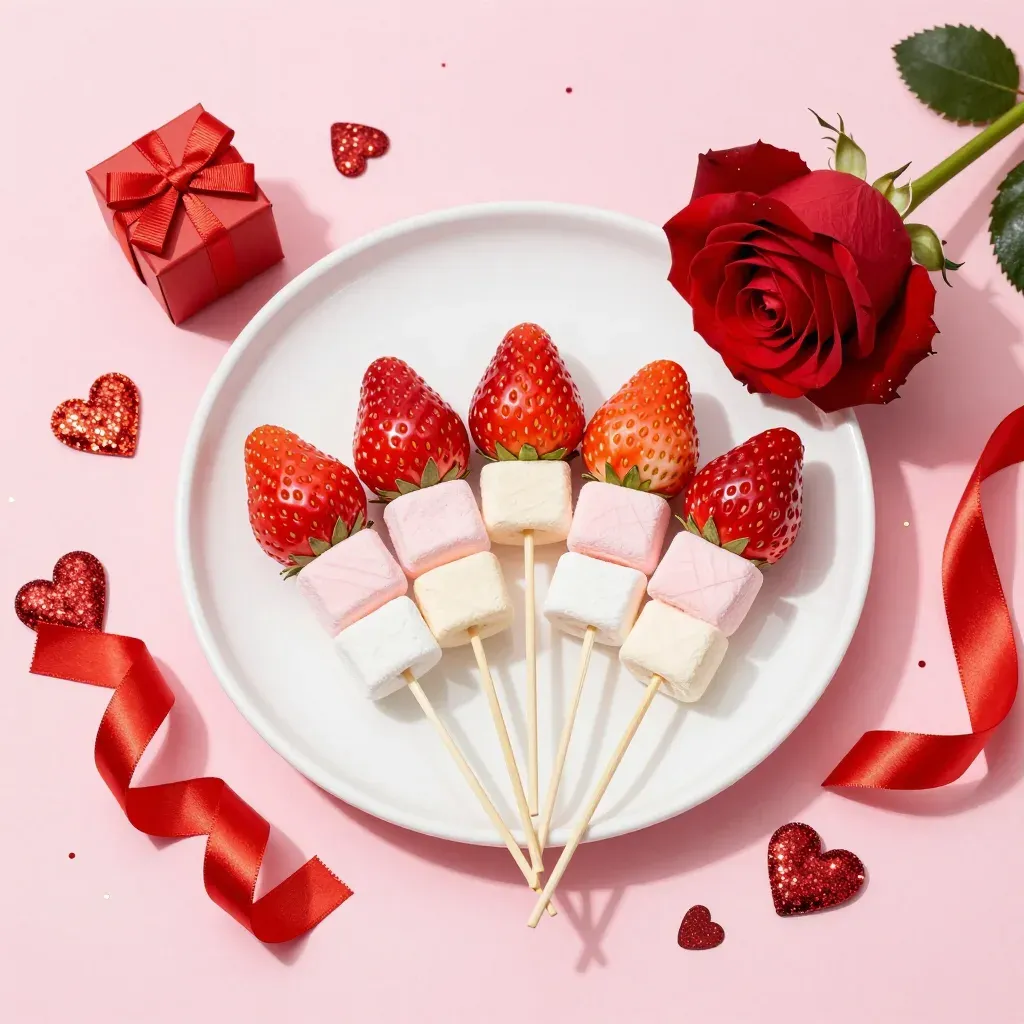 Strawberries and marshmallows are skewered on glossy, smooth wooden sticks, set against a soft pink backdrop with scattered red hearts and a red ribbon. The soft, diffused lighting highlights the textures and creates a balanced, symmetrical composition.