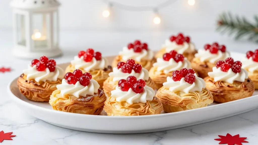 Golden, flaky pastries are artfully topped with a swirl of white cream and glossy red currants, set against a soft, diffused light that highlights their textures and colors. The pastries are arranged in a centered, festive display on a white plate, with a white marble countertop, small lantern, and string of lights creating a cozy, holiday ambiance.