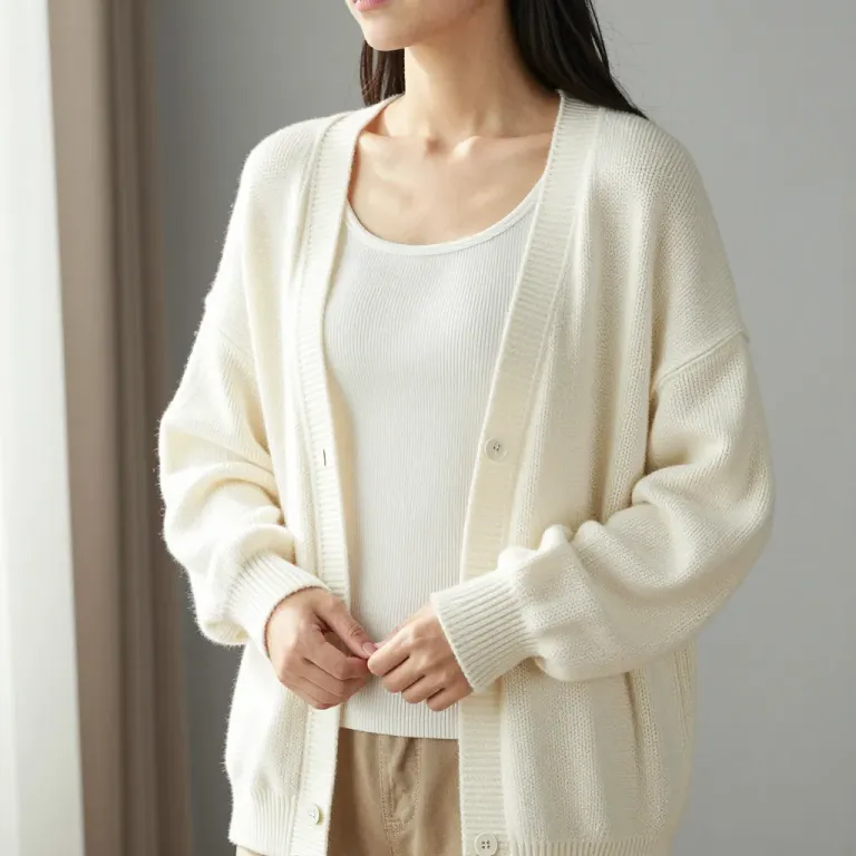 A woman showcases a cream-colored cardigan layered over a ribbed tank top, bathed in soft, natural light from a window. The neutral, blurred background enhances the focus on the subject and the texture of the cardigan.