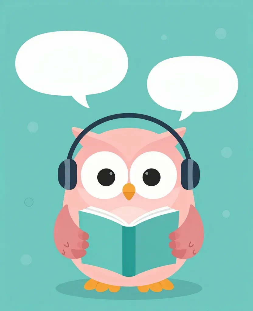 A soft, plush owl holds a teal book while wearing glossy headphones, illuminated by diffused light that highlights its features and the book's pages. The balanced composition and dreamy teal background with white specks create a calm and inviting atmosphere.