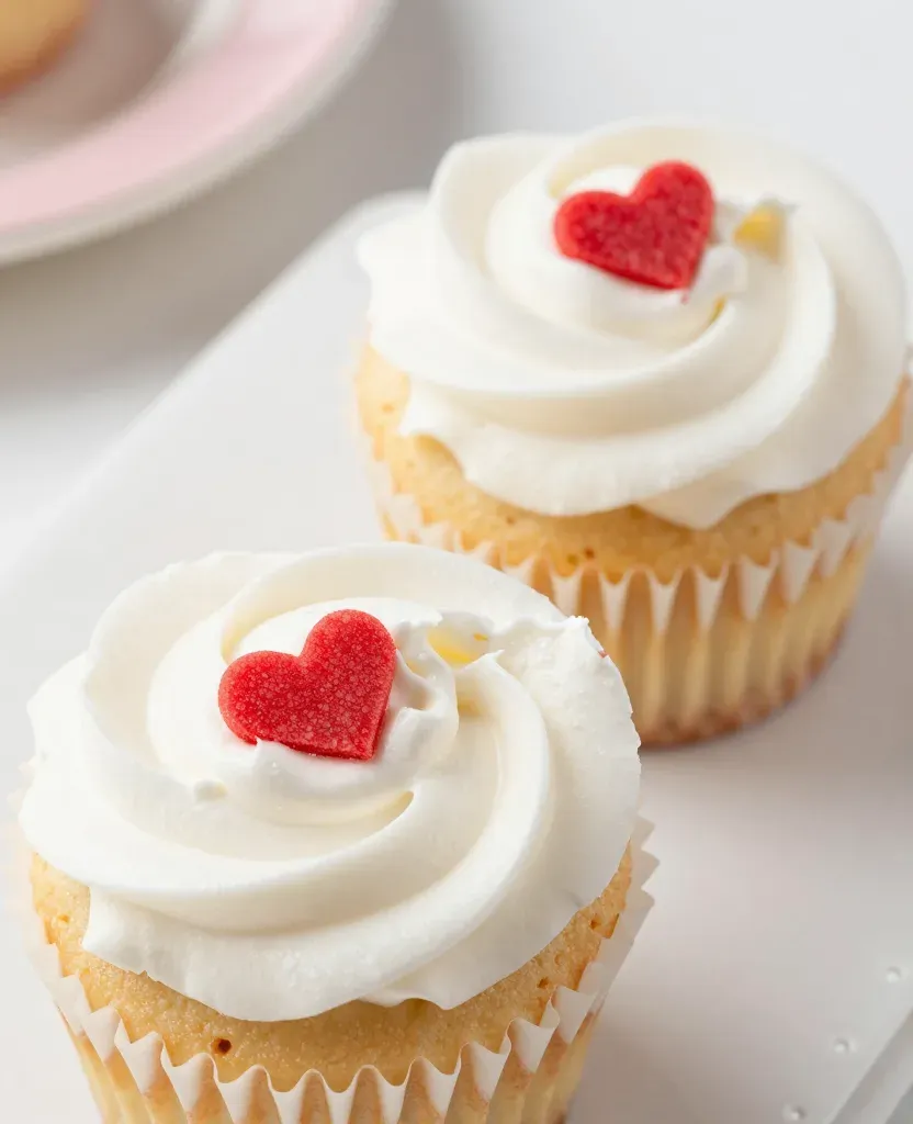 Close-up of vanilla cupcakes with smooth white frosting and glossy red heart decorations, highlighting the creamy texture and soft lighting. Shallow depth of field blurs the background, emphasizing the cupcakes and creating a clean, simple setting.