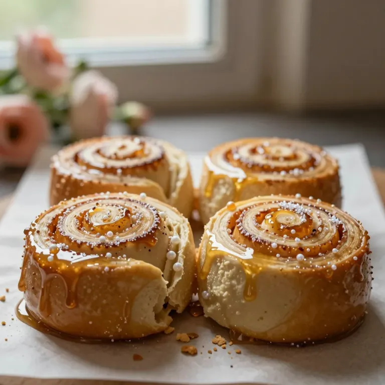 Golden-brown honey-glazed rolls with delicate sugar pearls, arranged in a square, showcasing their soft, fluffy interior under soft, natural light. The blurred background of pink flowers and a window enhances the image's elegance and natural beauty.
