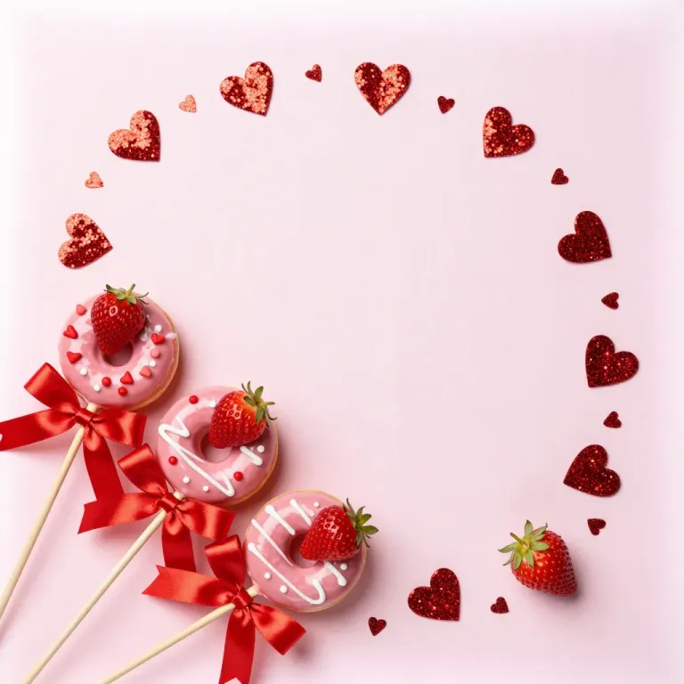 A flatlay arrangement of donut pops with pink glaze and fresh strawberries, highlighted by soft, diffused lighting that emphasizes the glossy texture and vibrant colors. The minimalistic, slightly blurred background with copy space makes this image ideal for Valentine's Day or sweet treats themes.