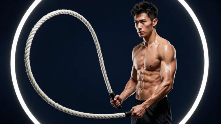 A shirtless muscular individual grips a thick, rough rope, highlighted by soft, diffused lighting that accentuates the sweat and muscle definition. The dark, blurred background emphasizes the subject and creates a focused, dramatic effect.