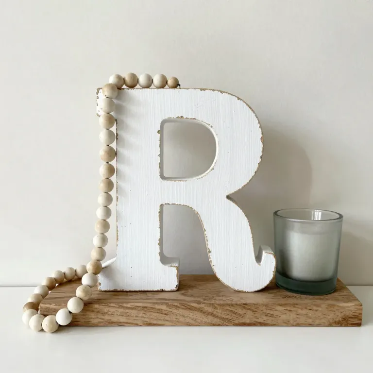 A white-painted letter 'R' with smooth wooden beads is centered on a wooden shelf, softly lit from the left, casting gentle shadows. The neutral white wall and simple wooden shelf provide a clean background, emphasizing the rustic charm and balanced composition.