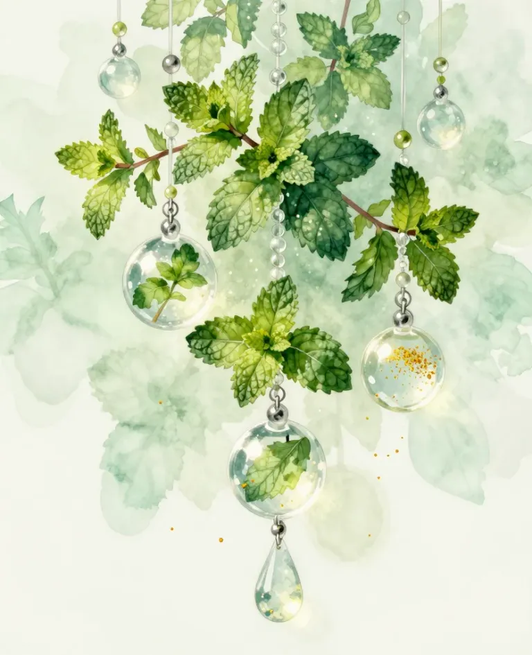 A mint branch with glossy leaves and clear orbs suspended in a cascading pattern, illuminated by soft, diffused light that creates highlights and reflections on the orbs and leaves. The subtle, out-of-focus mint leaves in the background provide a dreamy and natural backdrop.