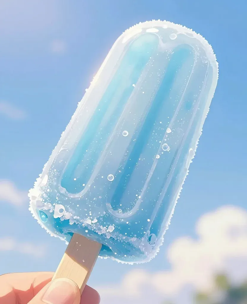 A close-up of a translucent blue popsicle with a wooden stick, melting under bright sunlight, creating highlights and reflections on its glossy surface. The clear blue sky in the background, slightly blurred, emphasizes the popsicle's vibrant color and texture.