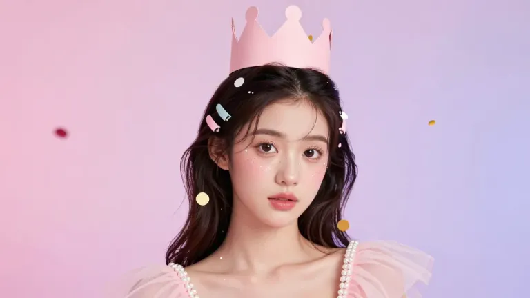 A young woman adorned with a pink paper crown and a delicate, ruffled dress with pearl embellishments, bathed in soft, diffused light that highlights her features and the texture of her dress. The blurred gradient background and scattered confetti create a dreamy, celebratory atmosphere, offering ample copy space for text.