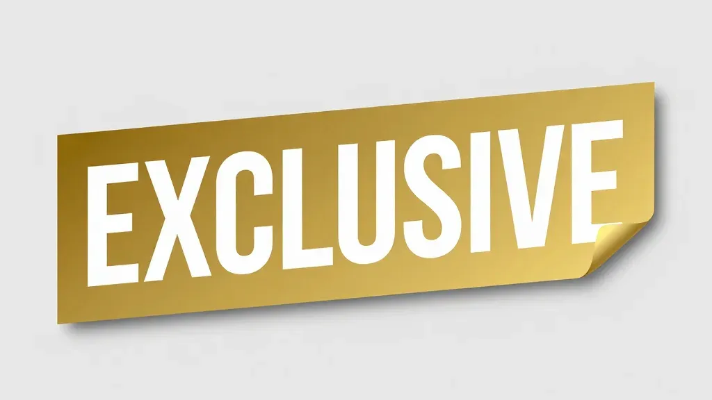 A glossy gold sticker with the word 'EXCLUSIVE' in white, slightly curled at the edges, set against a soft gray background. Direct lighting highlights the reflective surface and creates a shadow, emphasizing the sticker's premium quality and clean design.