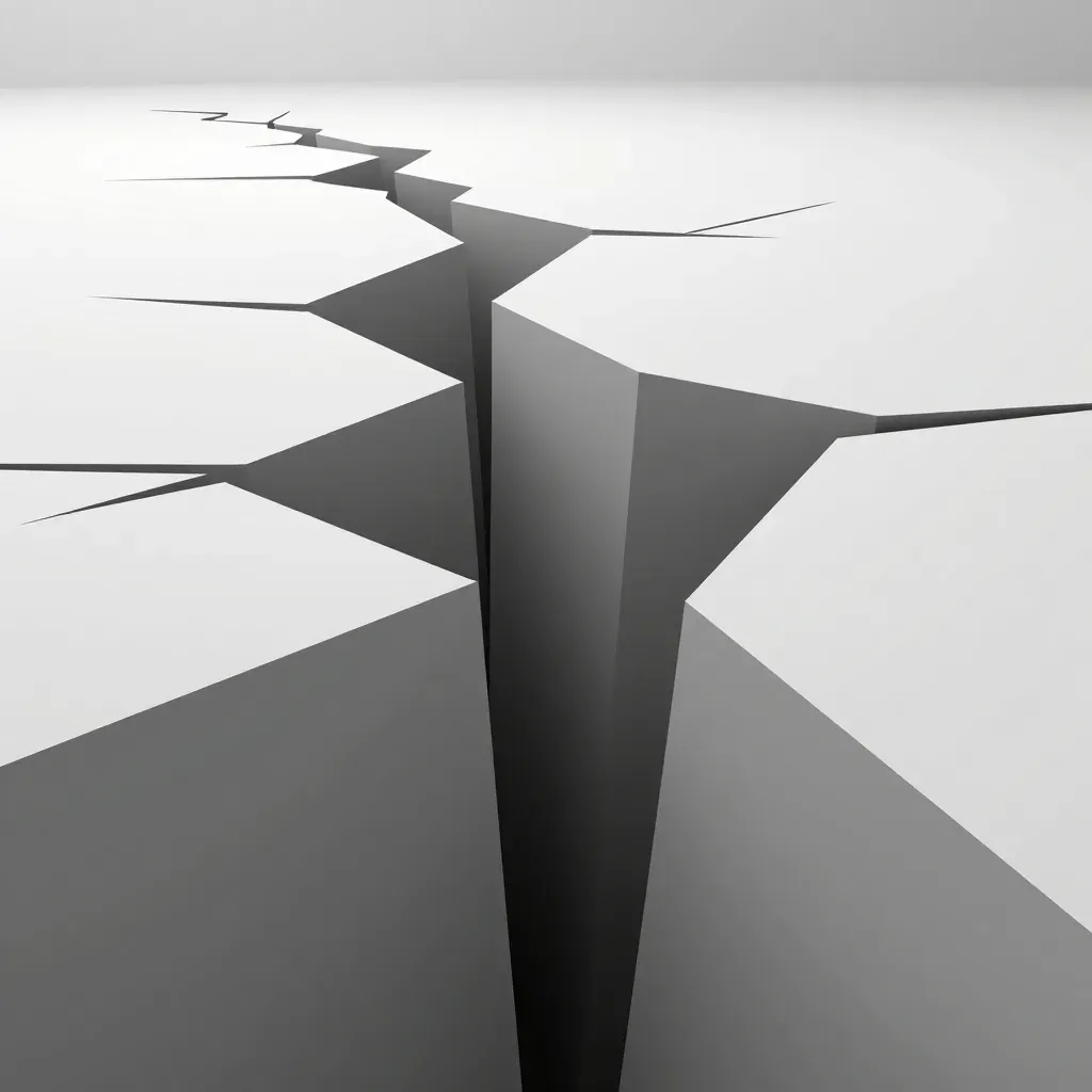 A deep, geometric crack in glossy, rough, three-dimensional material, softly lit with diffused shadows, emphasizing the crack's depth against a uniform white background. The clean, minimalistic composition provides ample copy space for design elements.