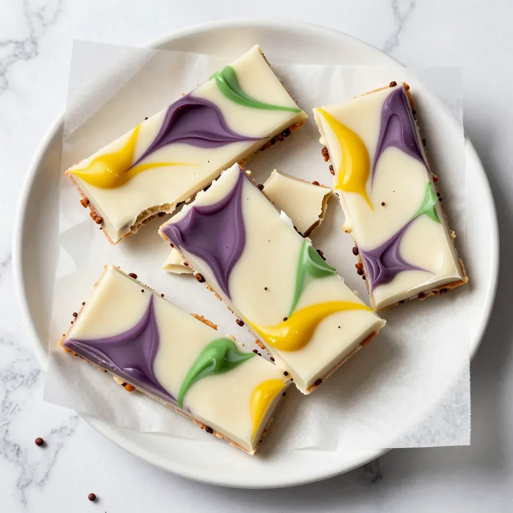 A visually striking arrangement of chocolate bark slabs with a glossy, swirled glaze of white, purple, yellow, and green, set against a clean white plate with parchment paper, highlighting the dessert's vibrant colors and smooth texture. The soft, diffused lighting enhances the glossy surface, creating a clean and minimalist backdrop.