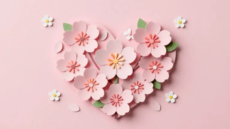 A heart-shaped arrangement of delicate cherry blossoms in soft pink, orange, and yellow hues, set against a pastel pink background. Subtle diffused lighting highlights the texture and color of the flowers, creating a balanced and visually appealing composition.