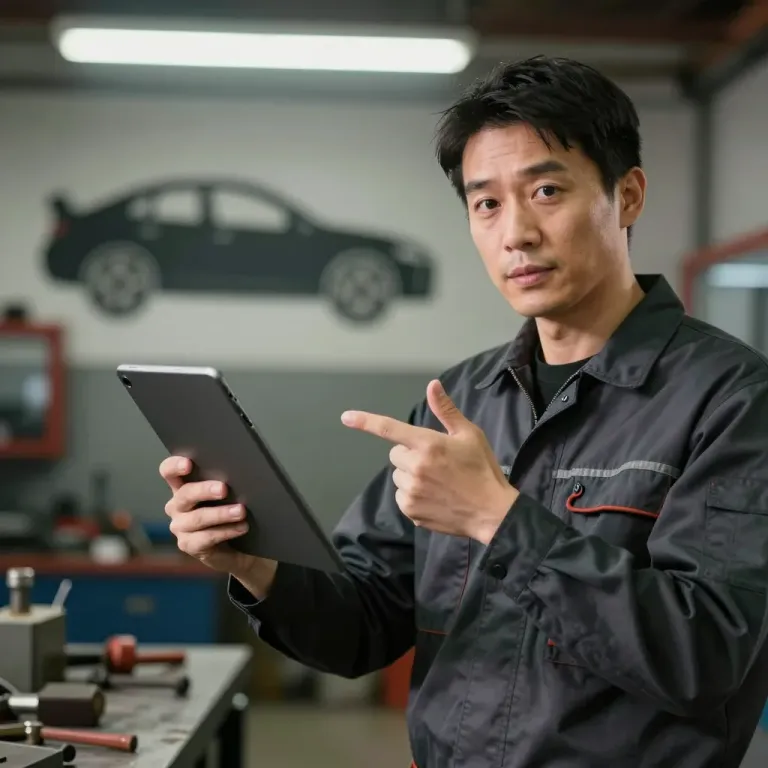 A mid-30s male mechanic in a dark gray work jacket with red stitching holds a matte black tablet and points at its screen, his expression focused and professional. Soft overhead fluorescent lighting creates even illumination with subtle shadows, and a shallow depth of field blurs the workshop background, emphasizing the subject and device.