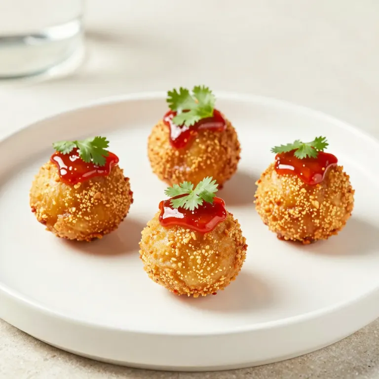 Four golden-brown sesame-coated croquettes are arranged on a white ceramic plate, each garnished with a glossy red sauce and fresh cilantro leaves. Soft overhead lighting highlights the textured crust and viscous sauce, while a shallow depth of field and clean background emphasize the appetizers with ample copy space.