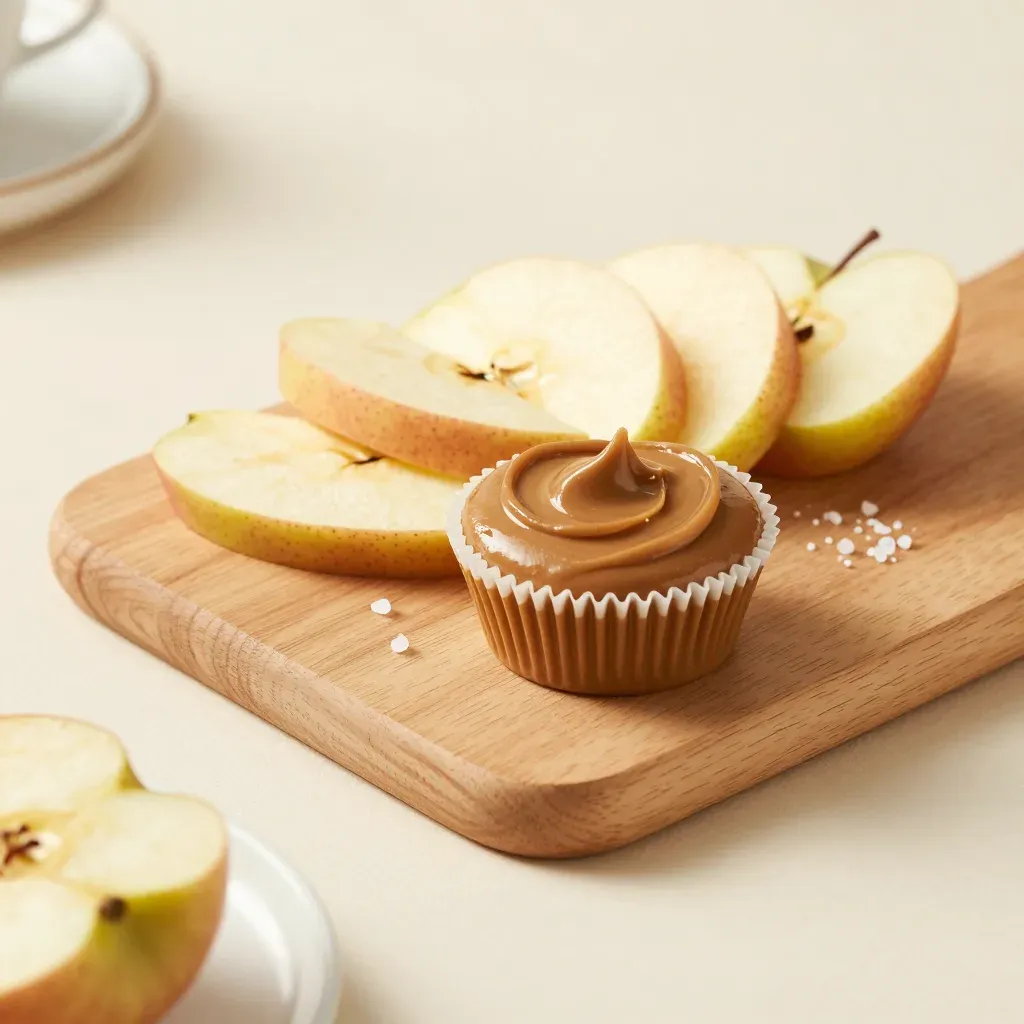 A cupcake with smooth caramel frosting is centered on a rough wooden board, surrounded by crisp apple slices, bathed in soft, natural light that creates gentle shadows and highlights. The balanced composition and neutral background ensure the focus remains on the appetizing subject.