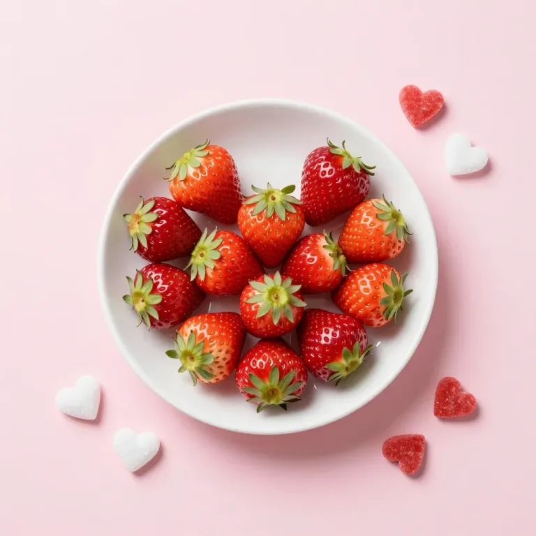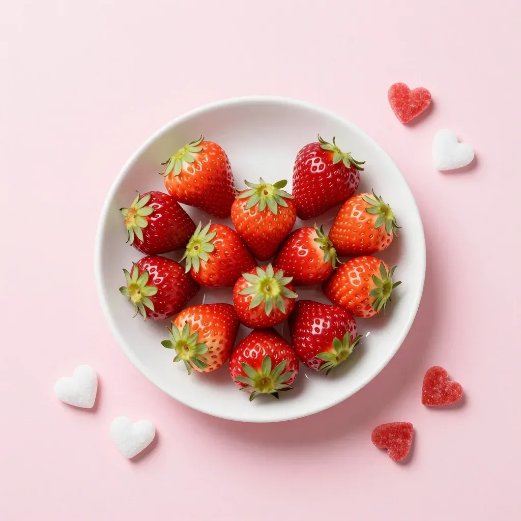 Glossy red strawberries with green caps are arranged in a bowl, softly lit to highlight their texture, set against a blurred pink background. The composition offers ample copy space for design integration.