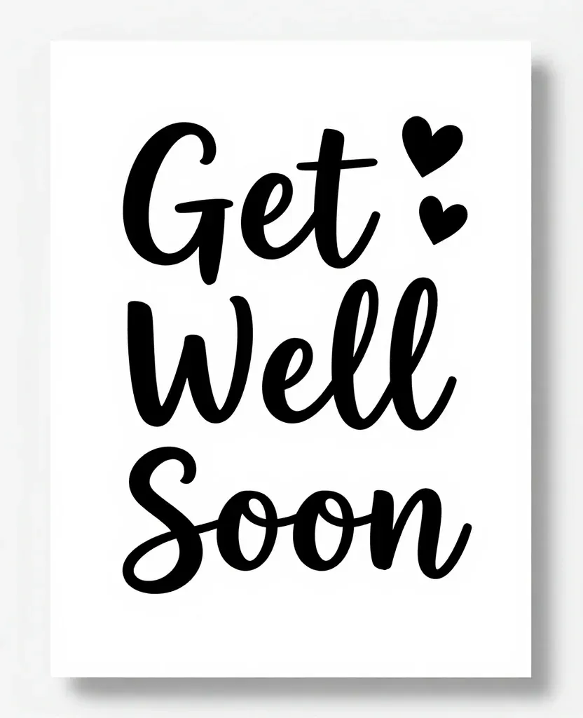 A glossy black 'Get Well Soon' card with cursive script and two small hearts, set against a clean white background. The soft, even lighting highlights the card's elegant design and creates gentle shadows, emphasizing its simplicity and balance.