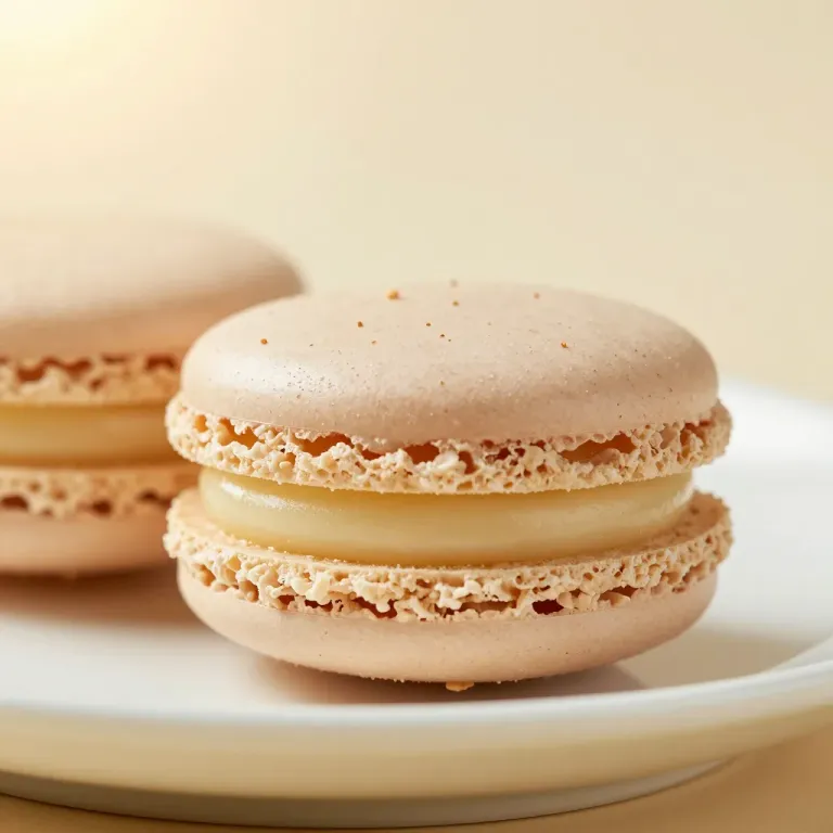 A close-up of a beige macaron with a delicate lace-like edge and a creamy pale yellow filling, softly lit by diffused golden light. The neutral beige background provides a clean and unobtrusive backdrop, emphasizing the macaron's texture and color.