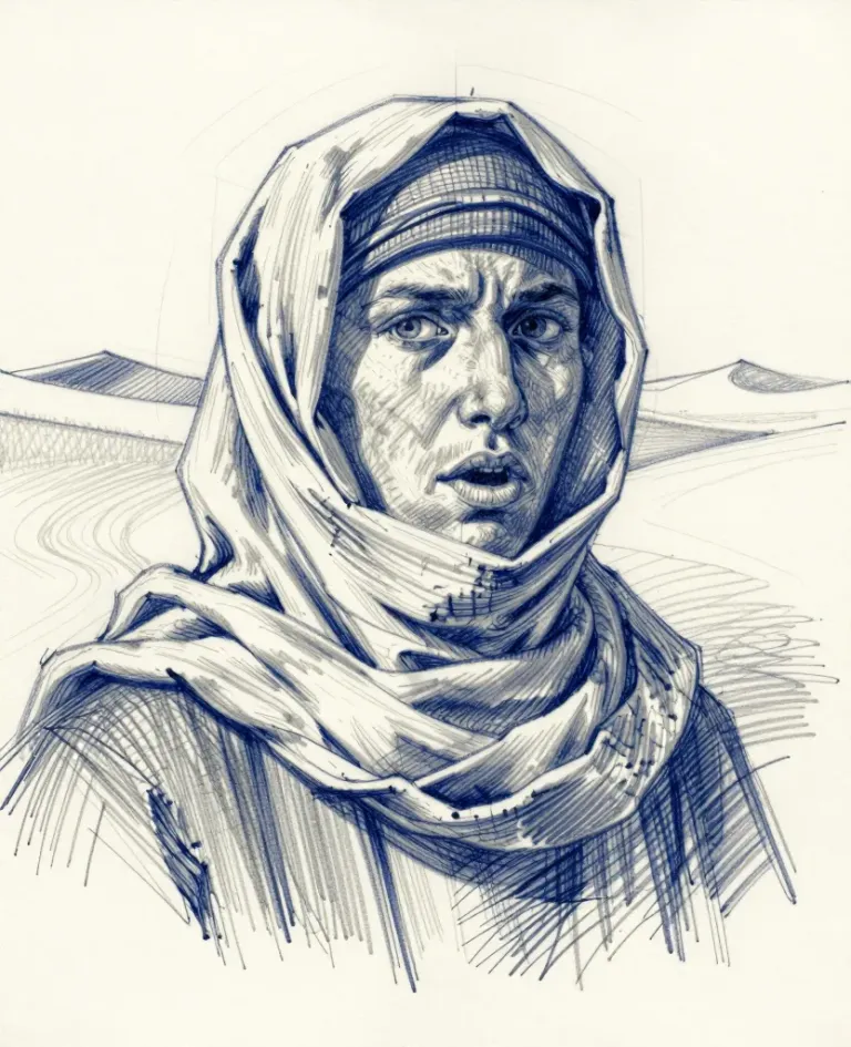 A figure in a traditional headscarf stands with a tense posture, the rough, layered scarf casting deep shadows that highlight the contours of the face and scarf. The sparse desert landscape in the background, slightly blurred, emphasizes the subject.