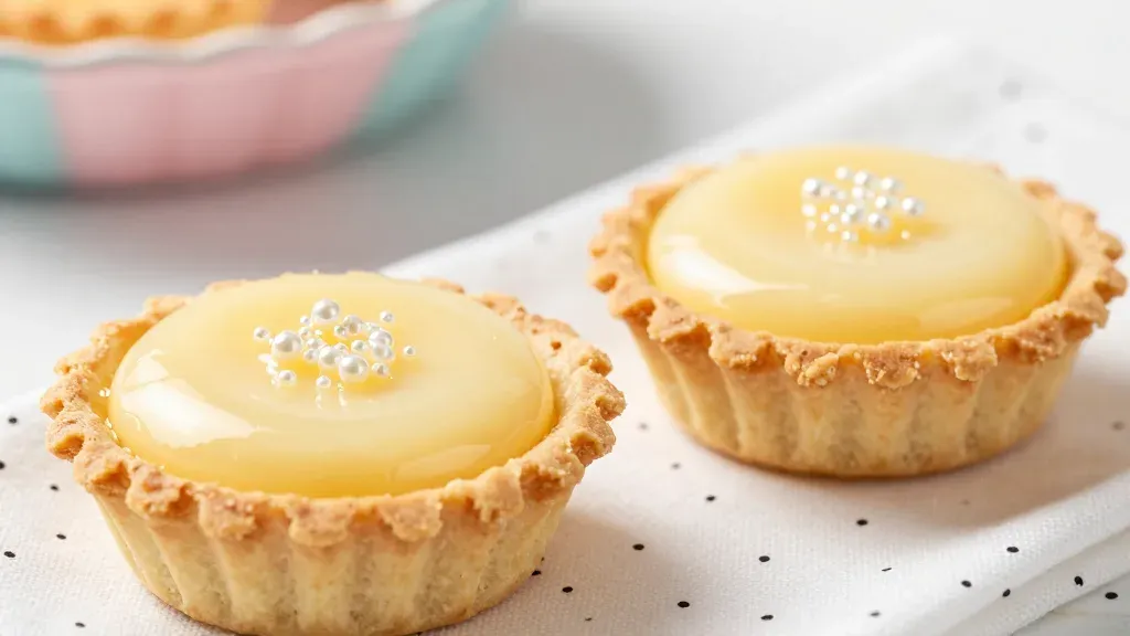 Close-up of glossy lemon curd tartlets with flaky crusts, softly lit to highlight texture, set against a clean white background with black polka dots, providing ample copy space.