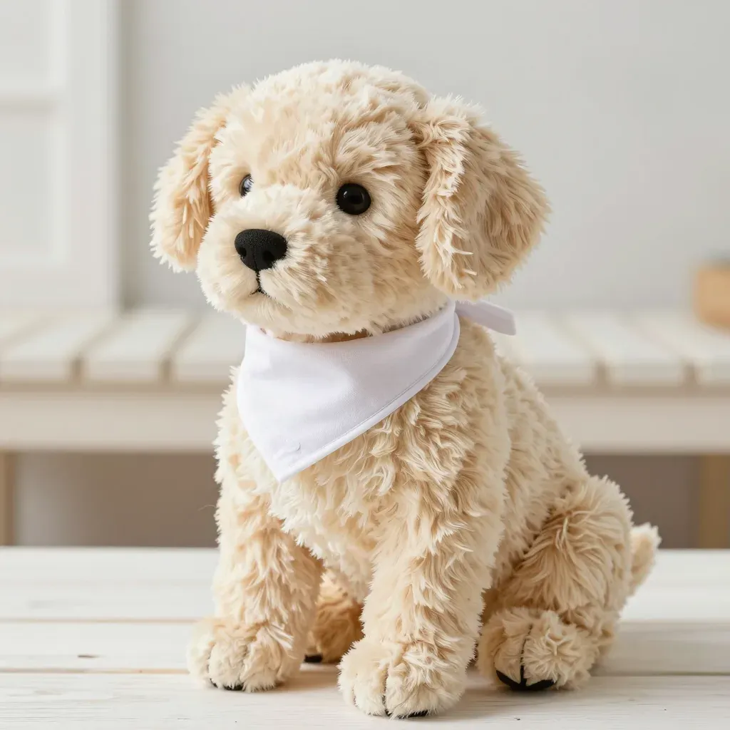 A soft, cream-colored plush puppy adorned with a white bandana sits on a wooden bench, bathed in soft, diffused light that creates gentle shadows, emphasizing the texture of the fur and the smoothness of the bandana. The shallow depth of field isolates the subject against a blurred background of a light-colored wall and wooden bench, providing a clean and simple backdrop.