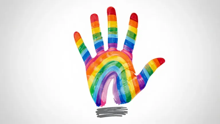 A vibrant rainbow handprint is painted on a textured surface, possibly paper or canvas, with even and diffused lighting and soft shadows. The handprint is centered, with the palm facing upwards and the fingers spread out, set against a light gray background that highlights the handprint's colors and details.