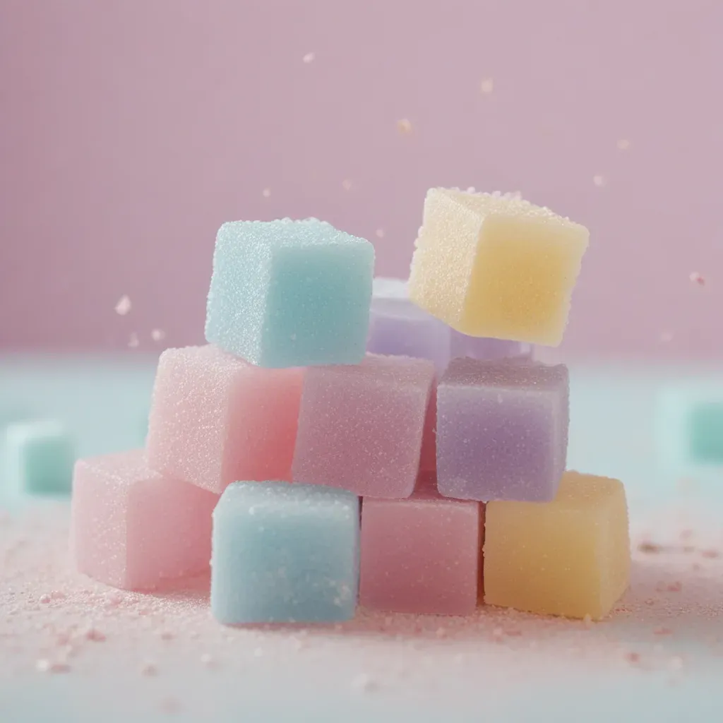 A pyramid of pastel-colored sugar cubes glistens under soft, diffused light, creating a dreamy, ethereal atmosphere. The composition, centered and slightly off-center, adds depth and visual interest, making it perfect for culinary or sweet-themed designs.