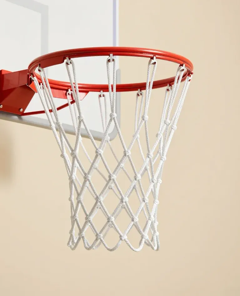 A close-up view of a glossy orange basketball rim with a white woven nylon net, slightly frayed at the ends, suspended against a neutral beige wall. The soft, even front lighting creates gentle highlights on the rim while the shallow depth of field blurs the background, emphasizing the net and rim with clean, uncluttered framing.