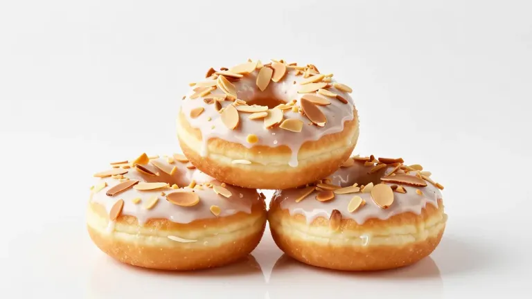A stack of almond-crusted donuts with white glossy icing and crunchy almond slices, illuminated by bright, diffused light from above, creating a soft glow and subtle shadows. The minimalistic white background draws attention to the donuts, offering ample copy space for design integration.