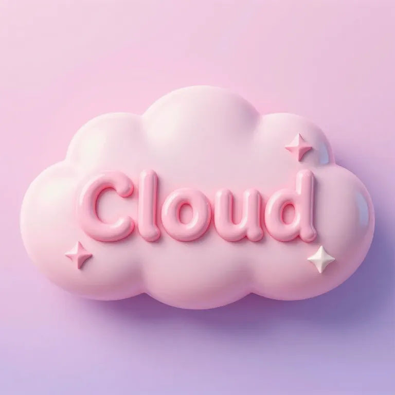 A glossy, cloud-like logo with the word 'Cloud' embossed in the center, illuminated by soft, diffused light from above, creating gentle highlights and shadows. The blurred gradient background in light pink to lavender enhances the dreamy, ethereal atmosphere, providing ample copy space for design integration.