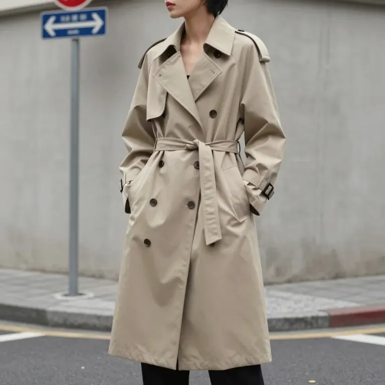 A person stands at a street corner wearing a glossy beige trench coat, illuminated by warm street lamp light that creates highlights and shadows. The background, slightly blurred, features a gray wall, street sign, and pavement, providing a clean urban context.