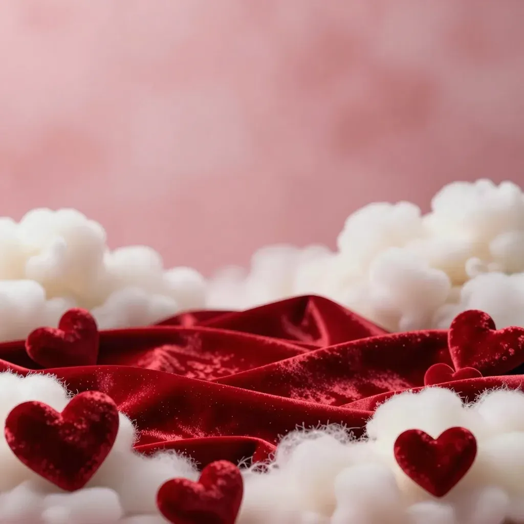 A red satin sheet adorned with plush red hearts and fluffy white clouds, creating a romantic and luxurious ambiance. The soft, diffused lighting enhances the texture and depth of the scene, making it ideal for wedding or Valentine's Day themes.