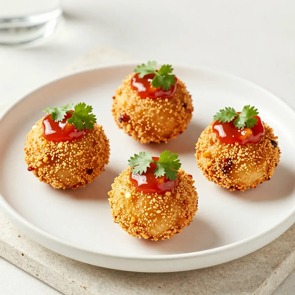 Four round appetizers with a crisp toasted sesame coating are garnished with glossy red sauce and fresh cilantro leaves, arranged on a white plate. Soft diffused overhead lighting highlights the textures with shallow depth of field and a minimalist background providing clean copy space.