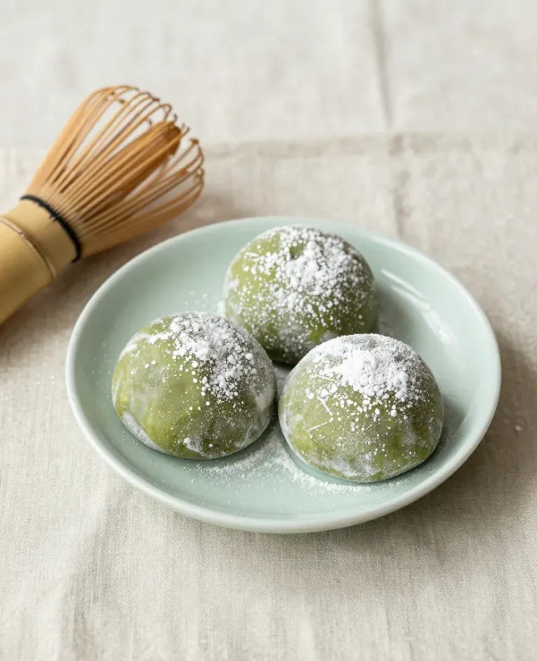 Three glossy matcha mochi balls dusted with powdered sugar are arranged on a pale green plate, with a bamboo whisk in the background. Soft, diffused lighting highlights the texture and vibrant green hue of the mochi, creating a clean and inviting composition.