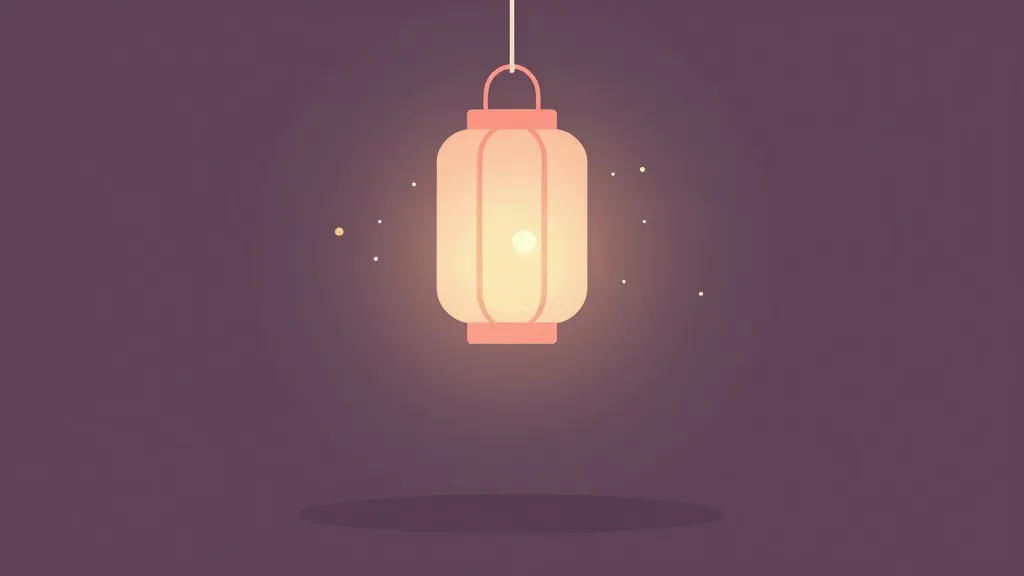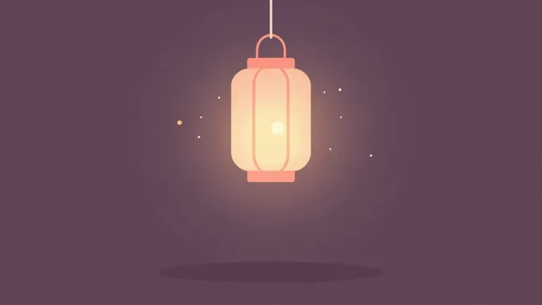 Two peachy-toned lanterns hang from above, casting a warm, soft light that illuminates their glossy surfaces and creates gentle shadows against a dark, blurred background. The composition draws the viewer's eye to the glowing lanterns, emphasizing their serene and inviting presence.