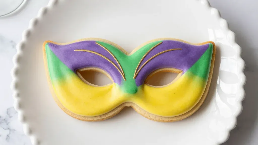 A Mardi Gras mask-shaped cookie with glossy icing in purple, green, and yellow hues, set against a white scalloped platter. Soft, diffused lighting highlights the cookie's glossy finish, creating a festive and elegant presentation.