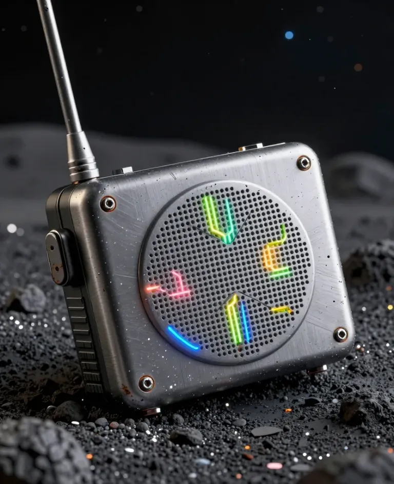 A cyber-radio transceiver with vibrant rainbow neon patterns and a blue glow, set against a dark, textured lunar-like background. The soft, ambient lighting highlights the glossy black exterior and creates a shallow depth of field, emphasizing the subject's futuristic design.