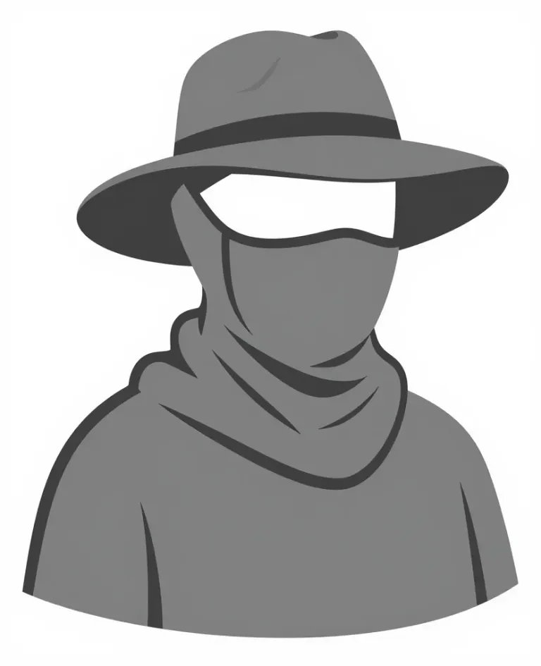 A figure in a wide-brimmed hat and loose scarf, with soft, diffused lighting and minimal background, creating a strong focal point. The neutral tones and soft shadows emphasize the subject's attire and expression.
